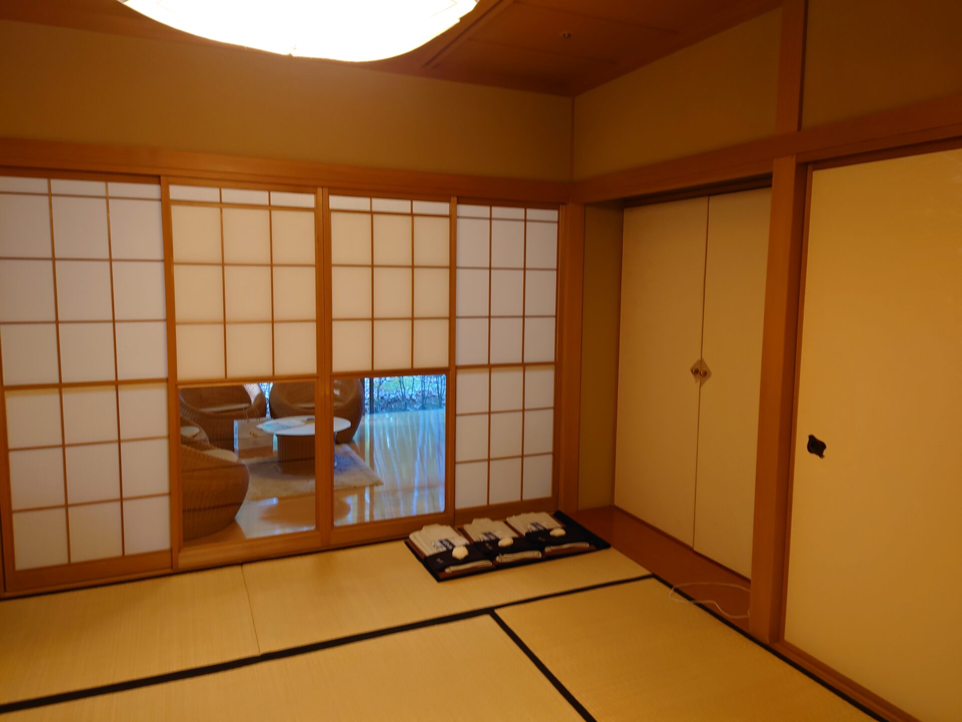 広い廊下を進んでお部屋へと案内され、今度はここでスリッパを脱ぎます。ここから先は露天風呂付きの離れ客室となっています。