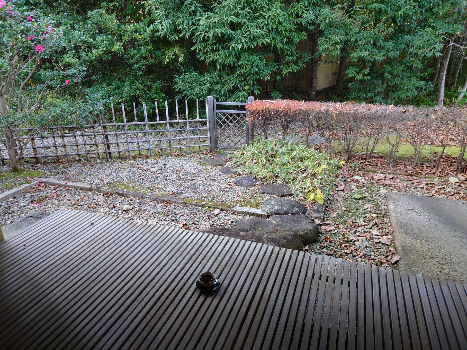 和室の縁側から外の景色も楽しめますが、今回泊まった部屋から見えたのは裏庭といった感じ。このお庭、離れ客室の避難経路にもなっているそうです。そのため、ほかの客室との仕切りがないので、庭に出るのは遠慮してほしいとのことでした。