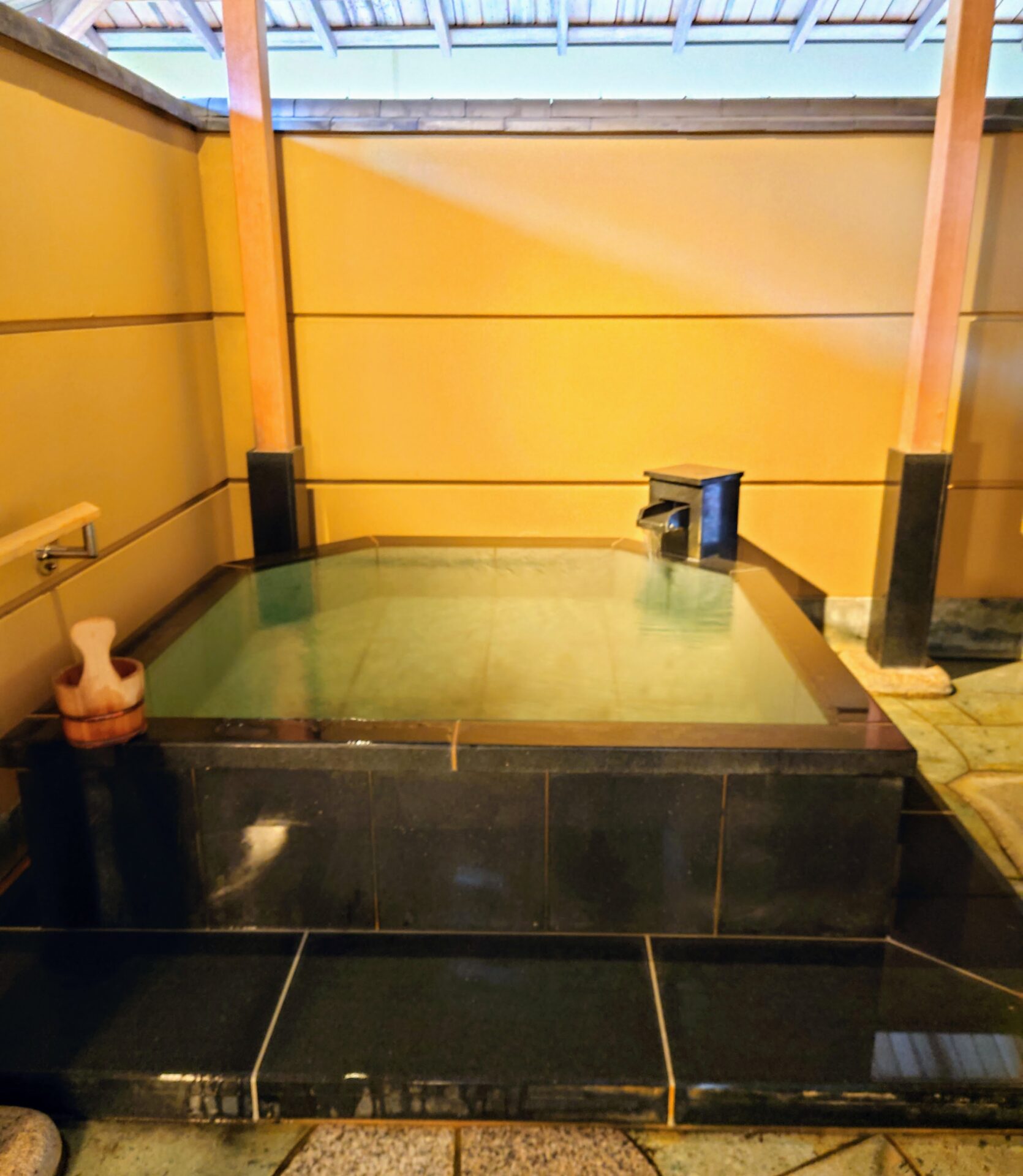 部屋付きの露天風呂は屋根がついていて、雨や雪でも気にせず入れます。ただ、屋根と壁で覆われているので露天風呂にしては解放感がなく、これも景色が楽しめないのが残念。